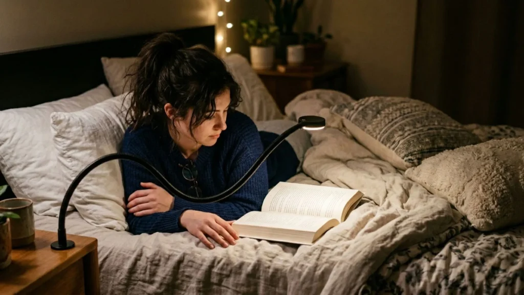 Luminárias com clip são dispositivos compactos que se prendem diretamente ao livro, cabeceira ou prateleira, oferecendo luz focalizada sem ocupar espaço. Já as luzes de pescoço contam com braços flexíveis que se ajustam ao redor do pescoço, permitindo leitura em qualquer posição, sem depender de apoio externo.